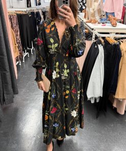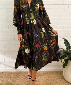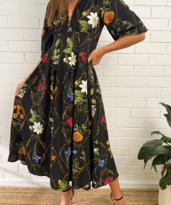 This black floral dress in this beautiful floral print is such an easy favourite. The stretchy cuffs and back waist make it super comfortable, and the scalloped V-neckline with the little hook-and-eye detail at the bust adds the prettiest touch. It’s the kind of dress that makes you feel pretty the second you put it on.