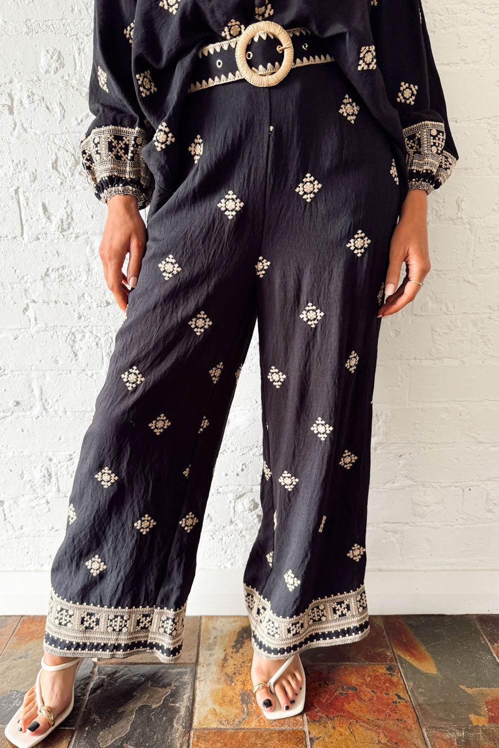 A lovely, flattering and loose wide leg shape with elastic at the back of the waist. The print is beautiful and looks expensive – we love the border down the bottom of the legs. Pair with the Estella Blouse for a matching set, though both items look great worn with other things.