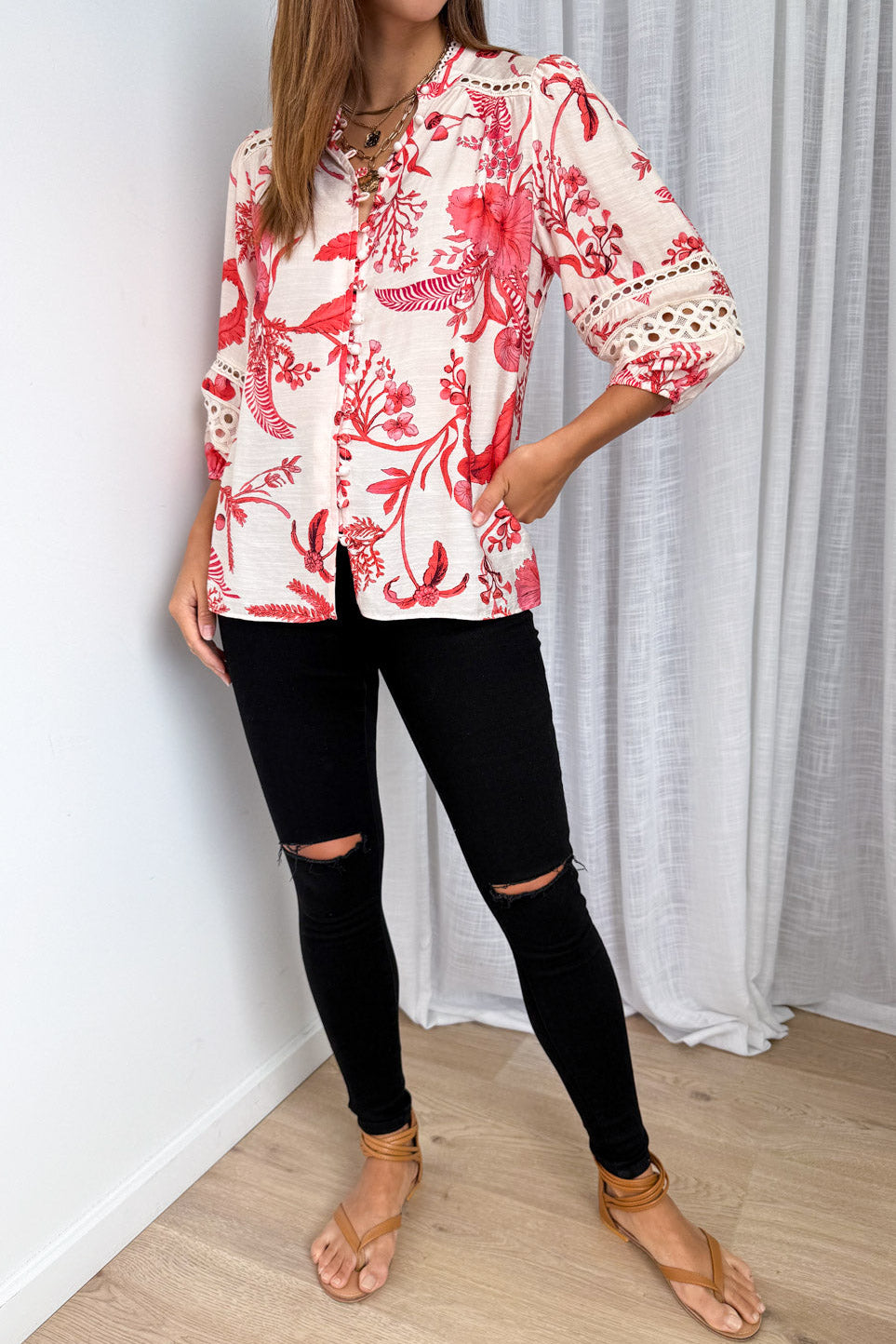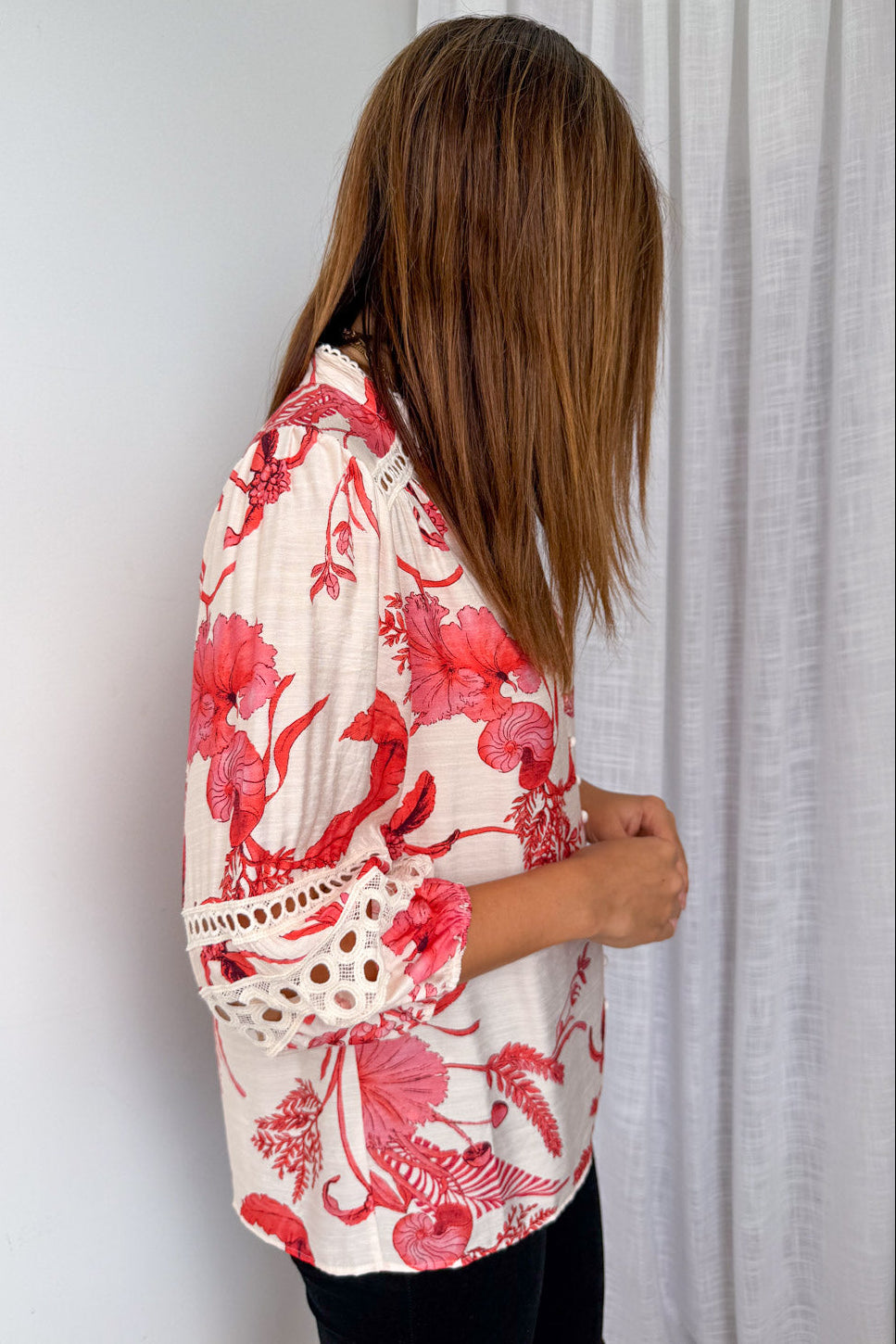 This blouse is really beautiful – the print, the shape, the sleeve detail, the way it sits, and the print. The lace trim on the puffy sleeves is a lovely touch – subtle, but they really elevate it. For work, weekends, dinners out – it’s an easy go to piece you’ll feel great in.