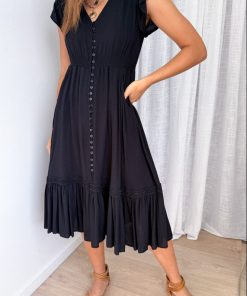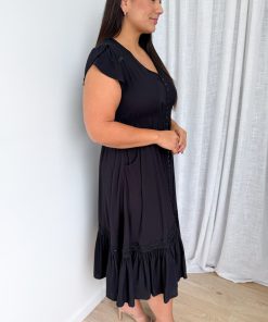 Pretty and fun, there’s lots of detail on this one. Lace detailing across the shoulders ant the front and back, and above the tier on the bottom of the dress. Beautiful buttons all the way down, so yes, you can wear it undone, and a fun split at the bottom where the buttons end. Elastic under the bust and really good pockets, this is an all the time dress ❤️