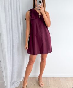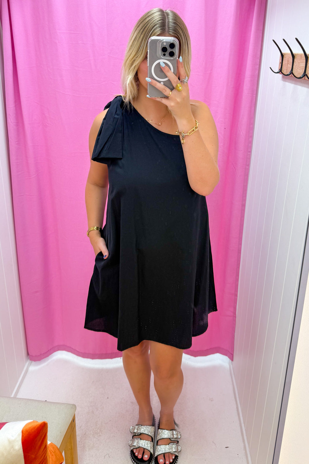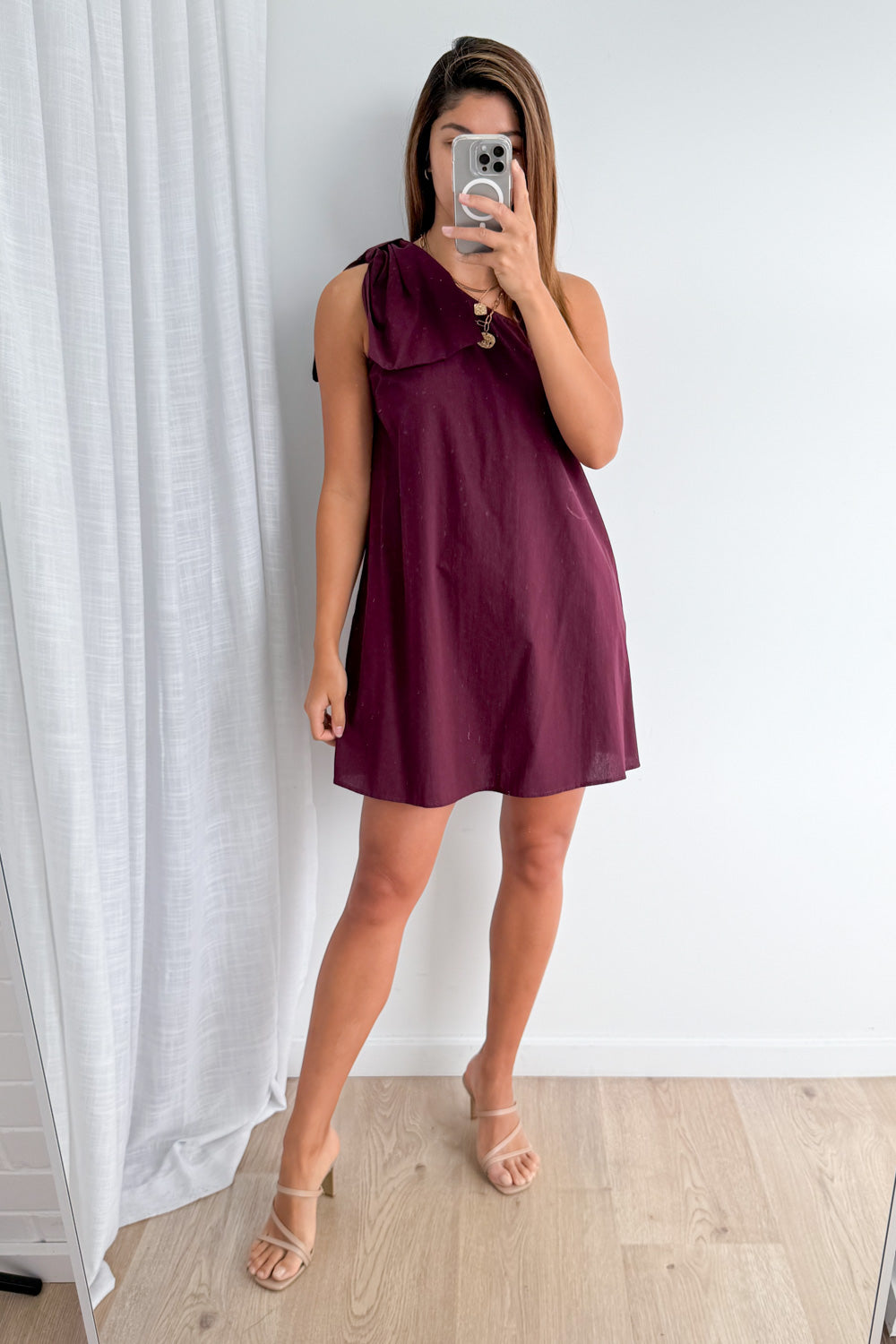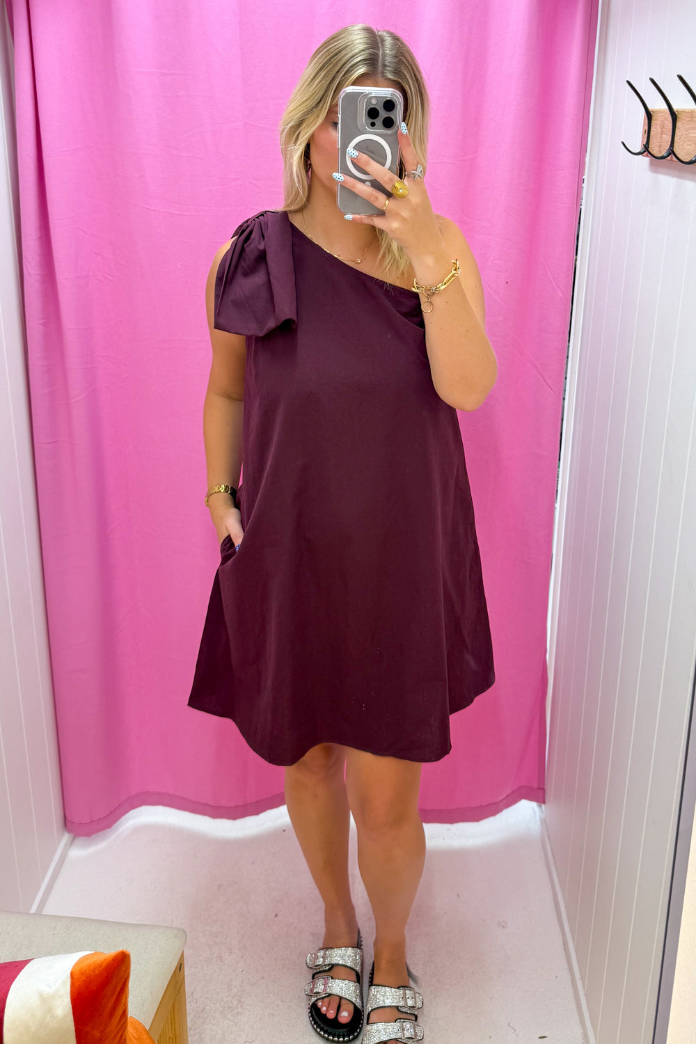 One shoulder with a gorgeous oversized floppy bow on the actual shoulder, we love this. It hides all lumps and bumps, and it’s not long but not too short. It’s not straight up and down, it has a little bit of shape to it, and it feels nice on.