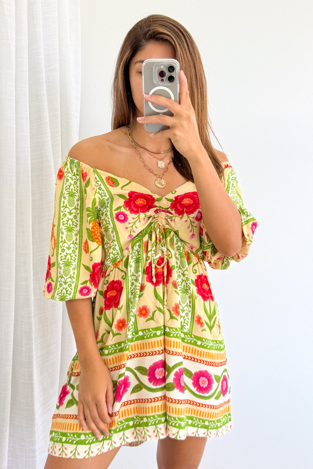 SO CUTE! I love this so much. The shape is flattering, can be worn on and off the shoulders, the length is good, it has POCKETS! And it feels good on. And how gorgeous is the print!
