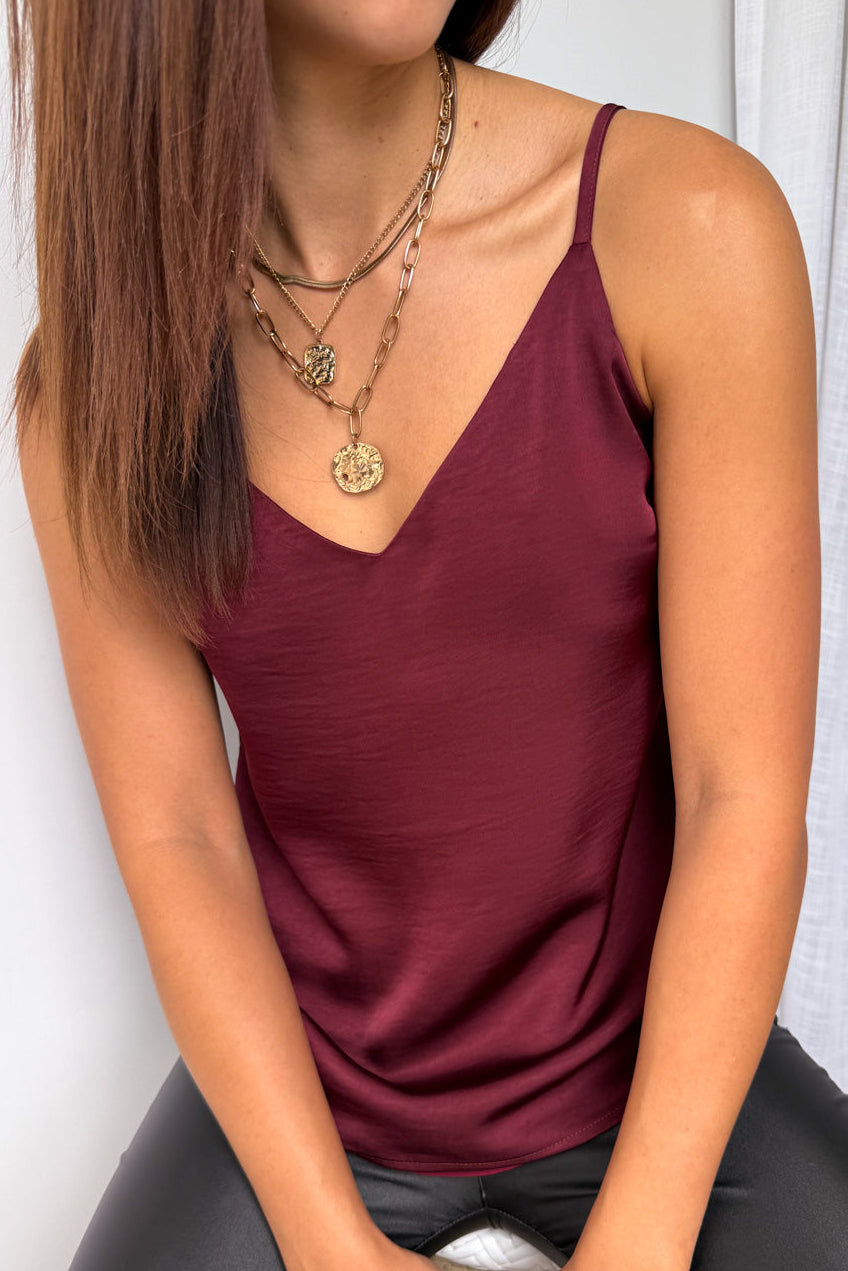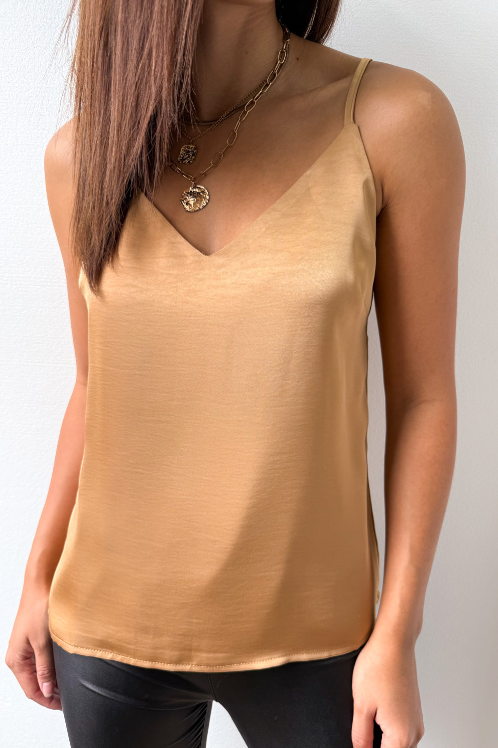 A silky kind of version of our Kellie Cami, which is just a really good basic. A good length, loose but not super baggy and has adjustable straps, a– win!