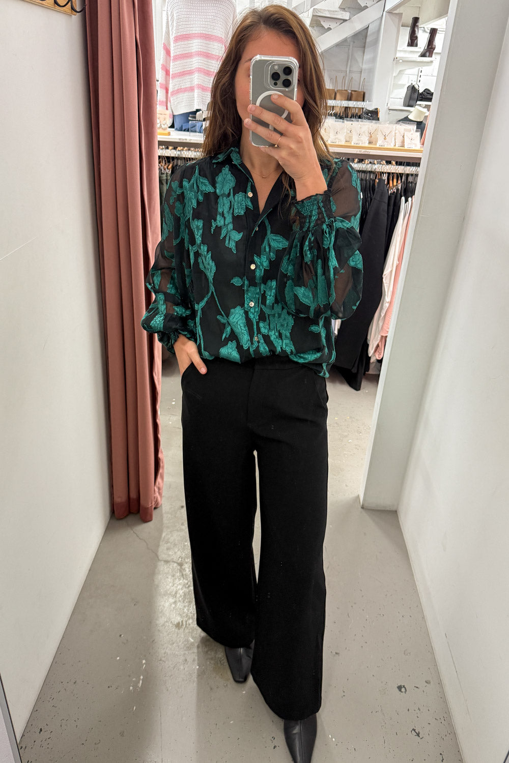This shirt is so gorgeous! The sheer sleeves feel super chic, and the lined bodice keeps you perfectly covered. The gold buttons are a beautiful touch, and the elastic cuffs let you wear the sleeves down or pulled up. Love.