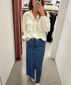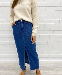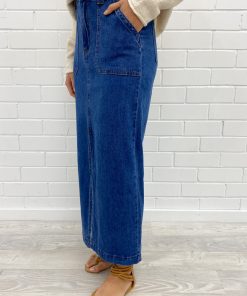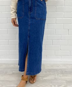 A really good denim midi skirt with a split that is just right, it’s not too high. The feature pockets are really cool, similar to our Drew Jeans, and the fit is just good. It’s a bit stretchy so you can do all the things in it, and it feels good on.
