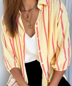 I LOVE THIS SO MUCH! It’s almost like a crinkly cheesecloth kind of fabric. The shirt has kind of balloon sleeves which have elastic at the cuffs so you can wear them as is OR pull them up, and the buttons are functional all the way down. A good length and shape, we are obsessed. We also have matching shorts – matching colours but a different stripe, and they look so, so cool together.