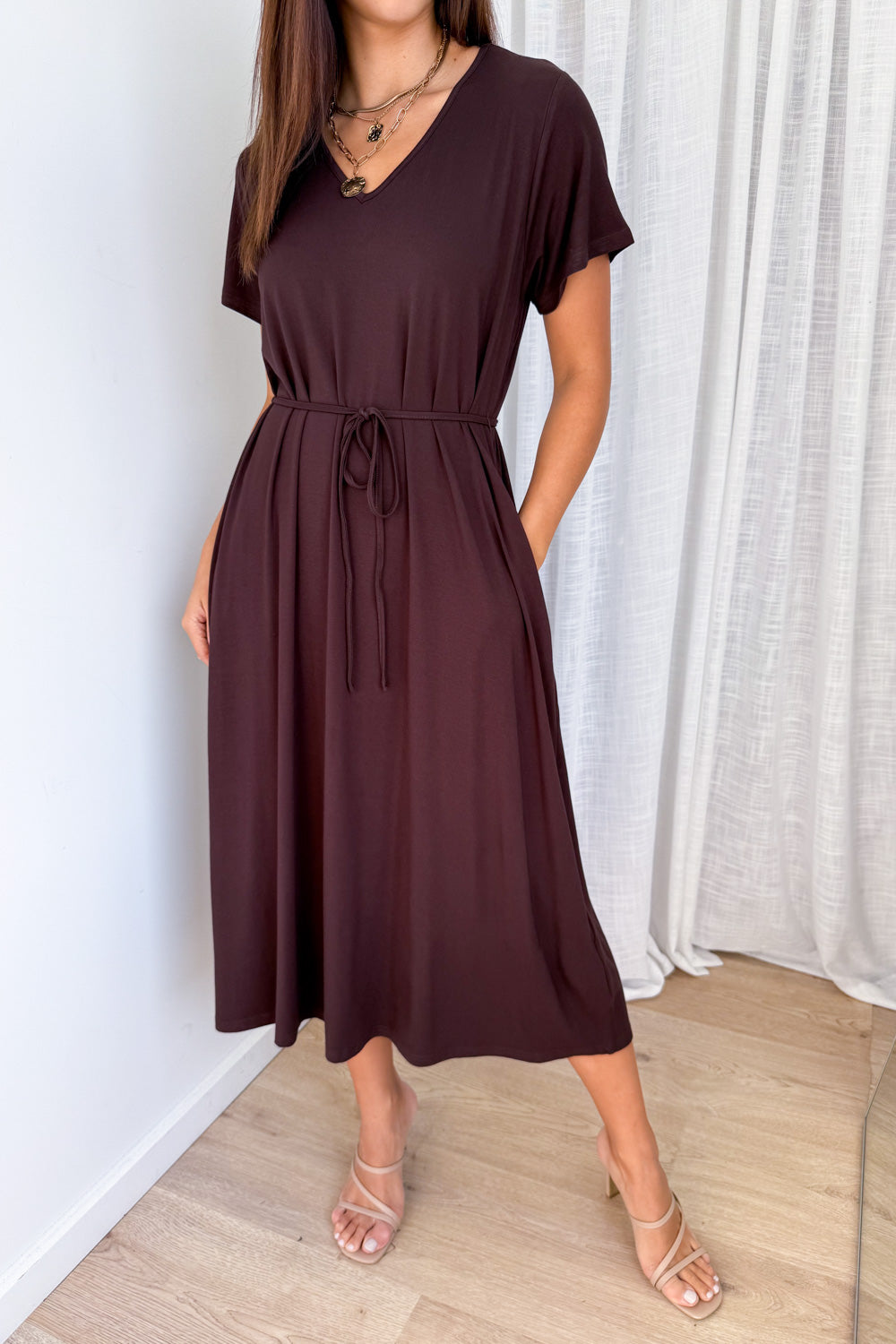 THIS DRESS IS STUNNING!!! So, so beautiful. The cut, the way it falls, the way it floats around you as you walk, and the simplicity of it. The sleeves are gorgeous – a good length and somehow pretty and the belt is removable belt. We LOVE it.