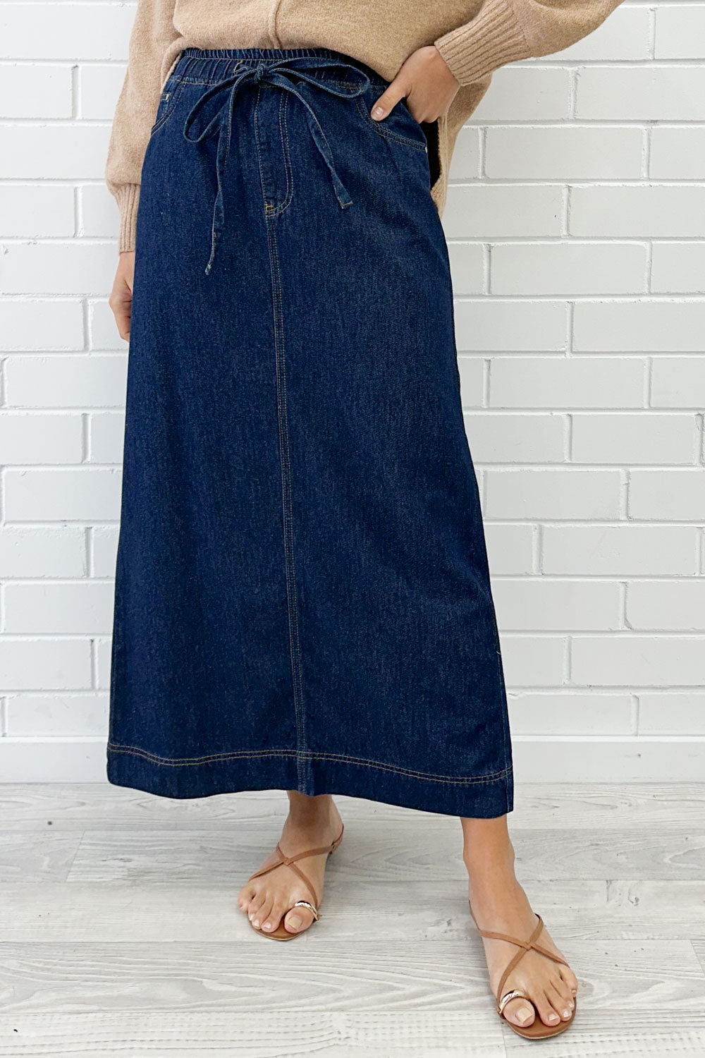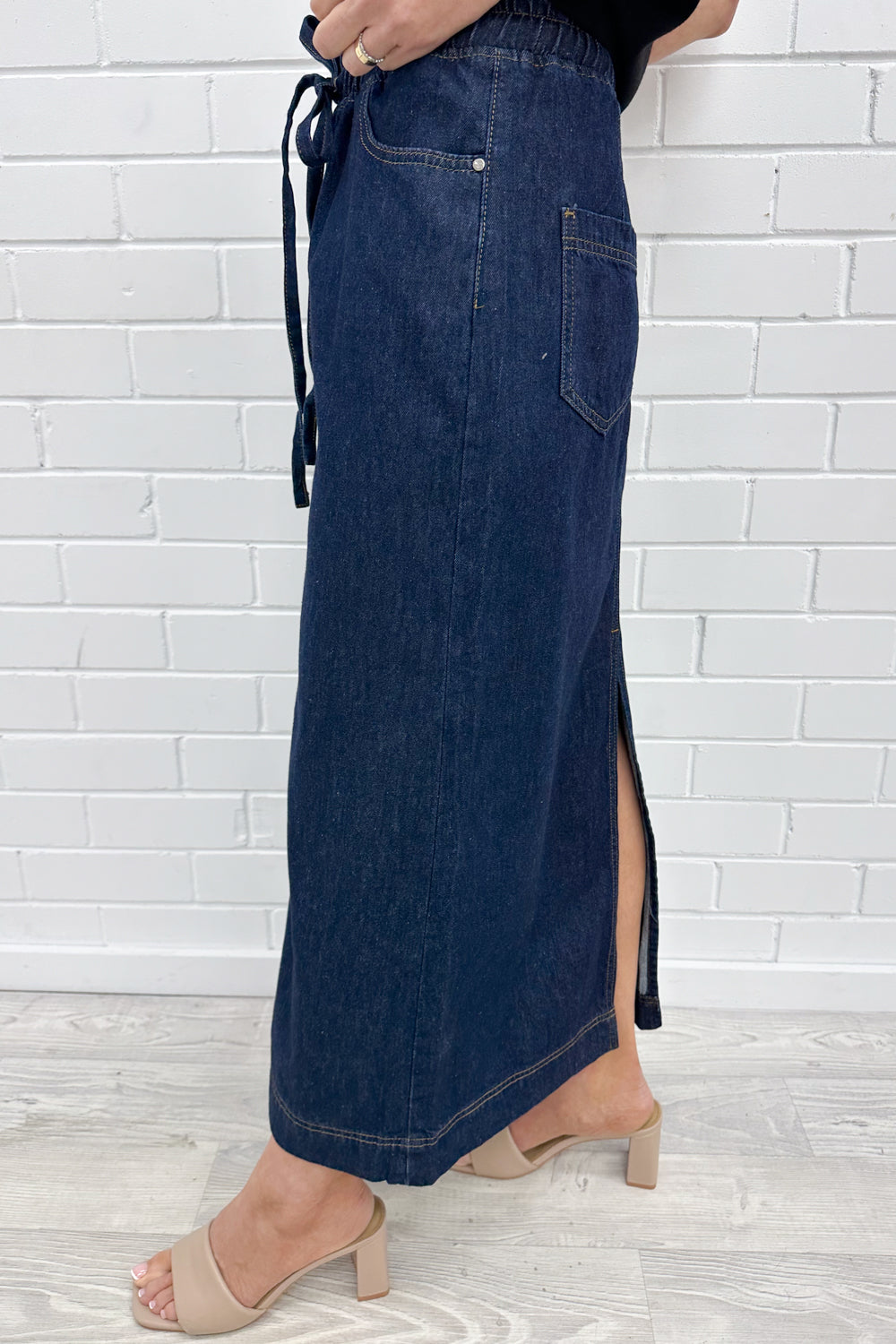 An easy to wear denim maxi skirt, nothing not to love about it. An elastic waist with a drawstring, pockets at the front and back, and an easy to wear, flattering shape. Perfect for all year round actually.